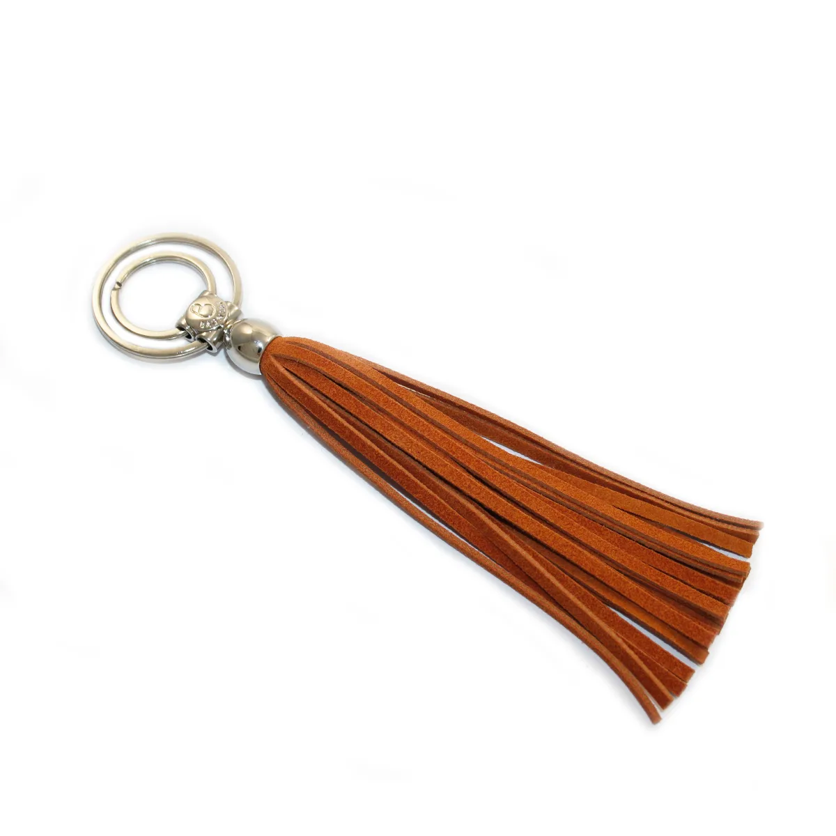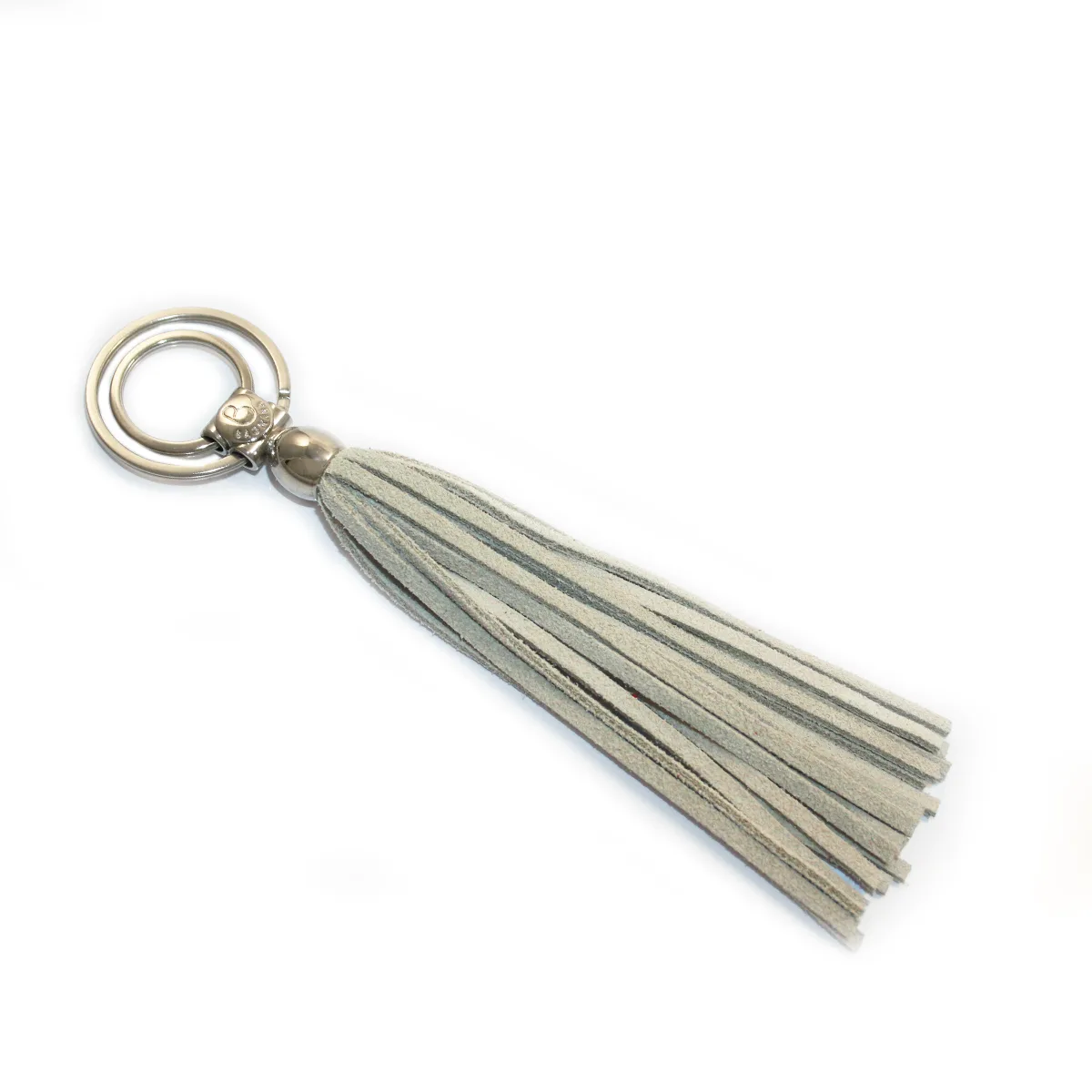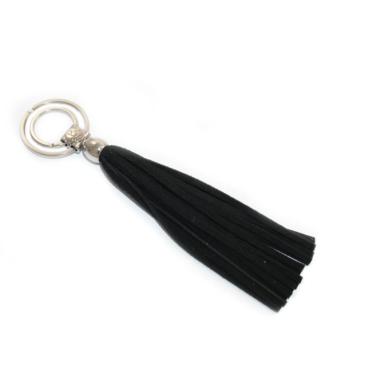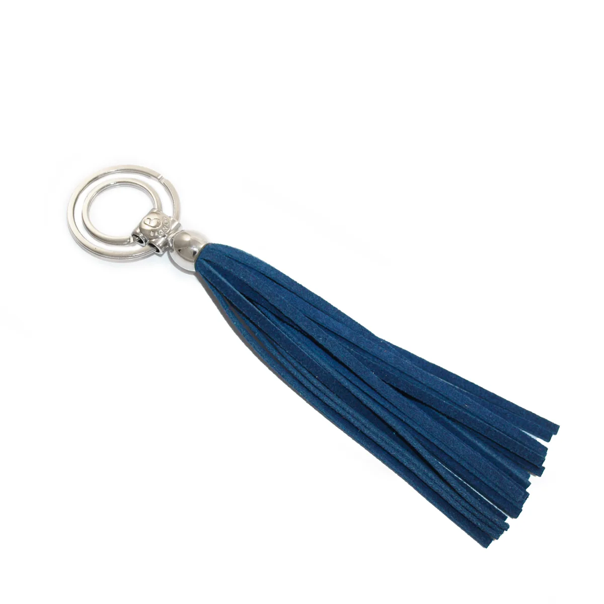 Un accessorio raffinato che unisce praticità e stile contemporaneo. La morbida nappa tagliata a frange si trasforma in una nappina leggera e sinuosa, donando movimento e un tocco di originalità. L’anello in metallo lucido, robusto e resistente, garantisce solidità e durata, mentre il piccolo dettaglio decorativo incastonato tra anello e nappina arricchisce ulteriormente il design.