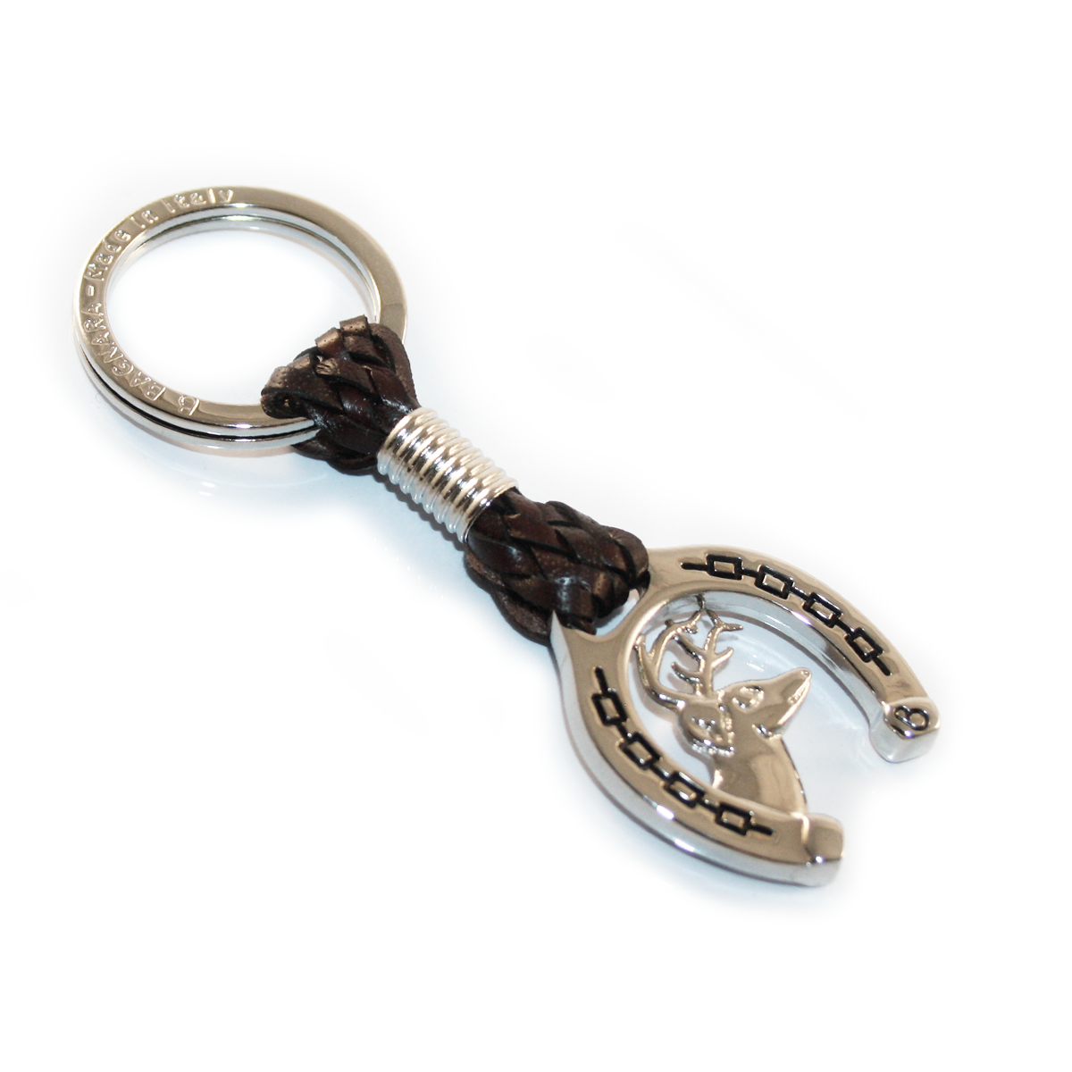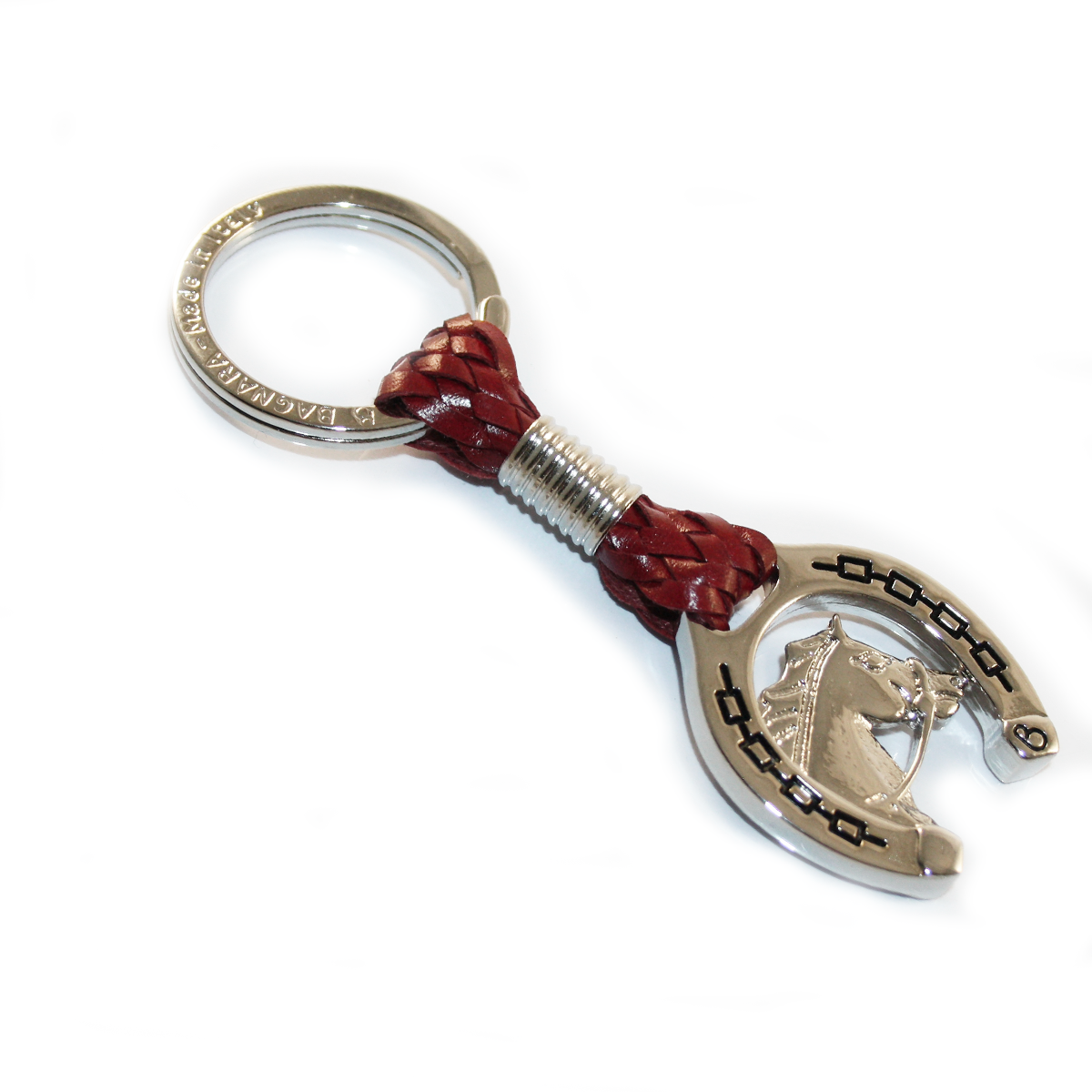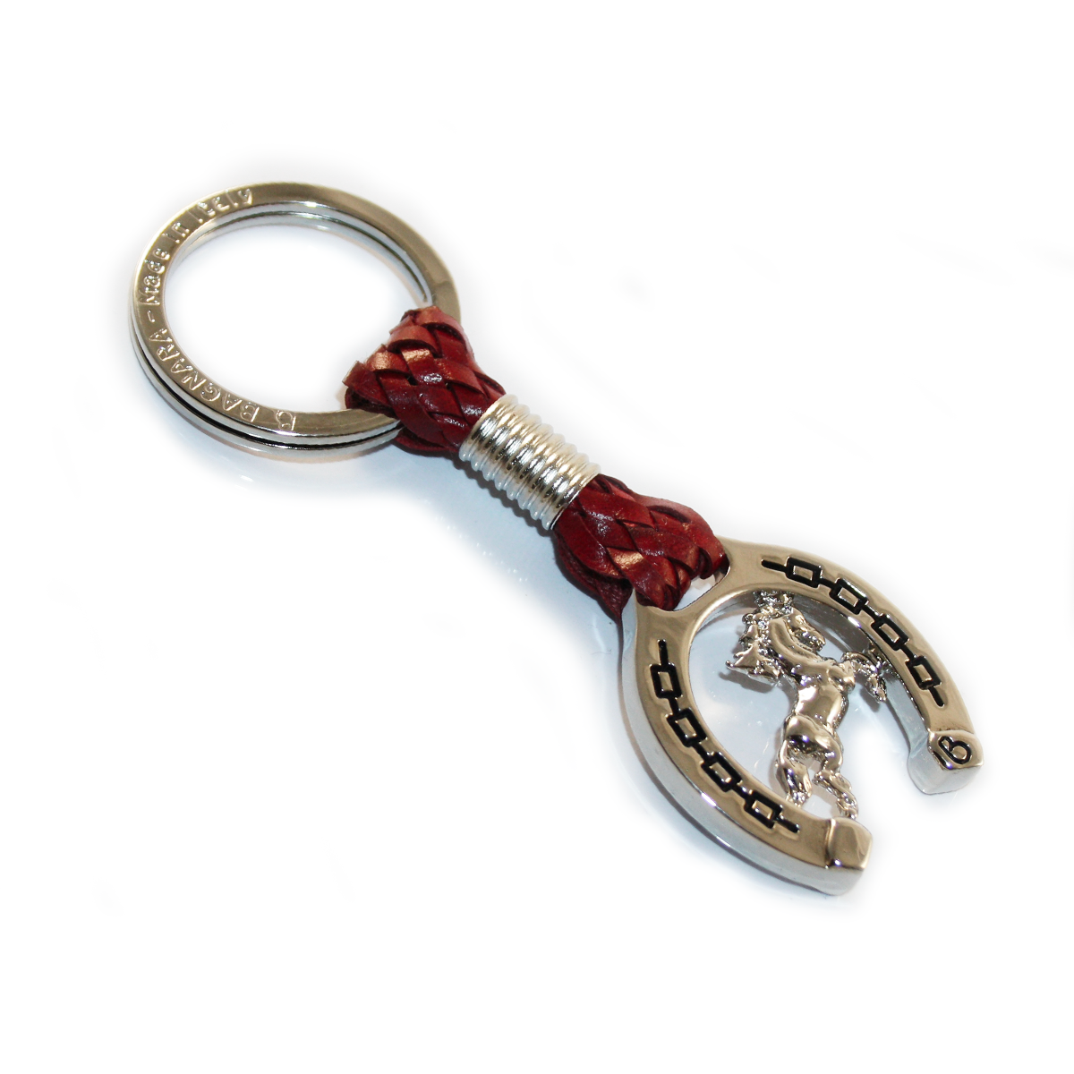 Il dettaglio distintivo è la finitura a forma di ferro di cavallo, simbolo universale di fortuna e protezione, all’interno del quale prende vita un soggetto in rilievo. A seconda della variante, il portachiavi può raffigurare: