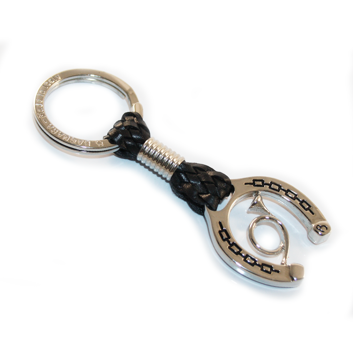 La combinazione tra metallo e pelle intrecciata crea un contrasto armonioso, capace di trasformare un oggetto di uso quotidiano in un piccolo gioiello da portare sempre con sé.