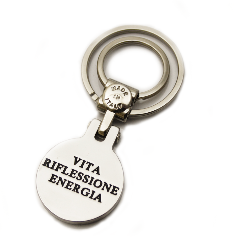 Un portachiavi dal forte valore simbolico, realizzato in metallo lucido e impreziosito da un design elegante e significativo. Da un lato troviamo l’incisione della scritta “VITA, RIFLESSIONE, ENERGIA”, parole che racchiudono un augurio e un messaggio positivo da portare sempre con sé.